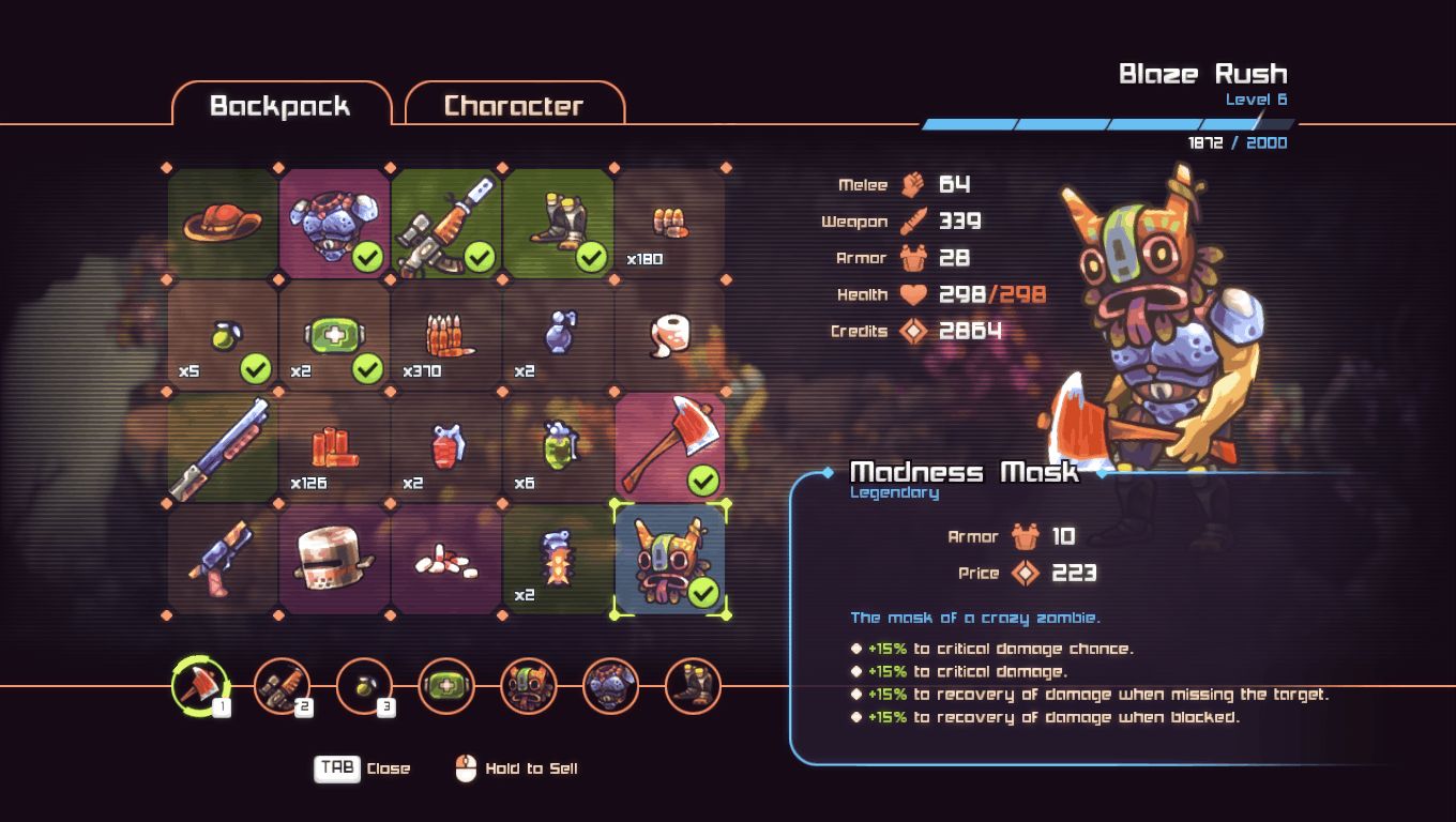 Zombotron делает еще один шаг вперед с этой системой, предлагая улучшаемое снаряжение и оружие на протяжении всей игры. С ограниченным пространством в рюкзаке есть некоторое микроуправление с продажей снаряжения и переключением оружия, но большая часть этого процесса помогает добавить в игру столь необходимую глубину.