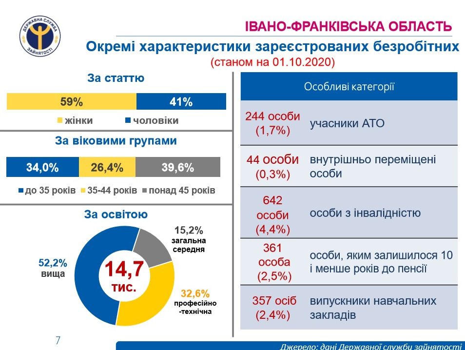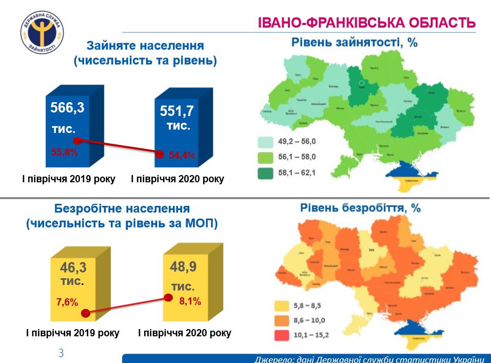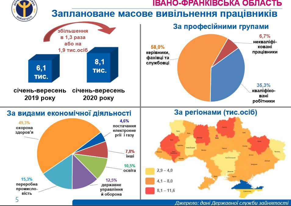По официальным данным Ивано-Франковского областного центра занятости населения, в январе-сентябре 2020 года услугами государственной службы поиска работы воспользовалось 80,5 тыс. человек. безработных граждан. Получили статус безработных за 9 месяцев 2020 года 21,9 тыс. лиц. При содействии службы занятости работу получили 18,8 тысячи человек. Пособие по безработице получили 28,2 тысячи граждан (средняя сумма помощи в сентябре 2020 года составила 3,1 тысячи гривен). Далее на frankivsk.one.