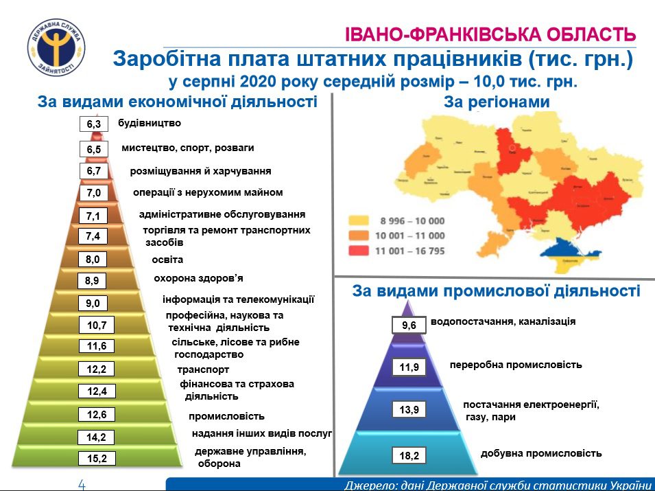 Государственная служба статистики Украины также опубликовала заработную плату штатных работников. В августе 2020 года ее средняя сумма в Ивано-Франковской области составила 10 тысяч гривен. Среди западных соседей эта цифра больше только во Львове, где она составляет 10-11 тысяч.